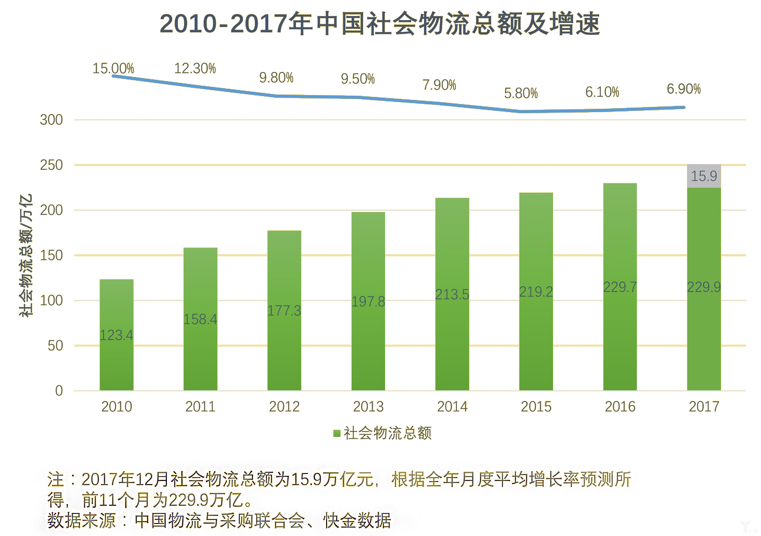 2010-2017年中國社會物流總額及增速