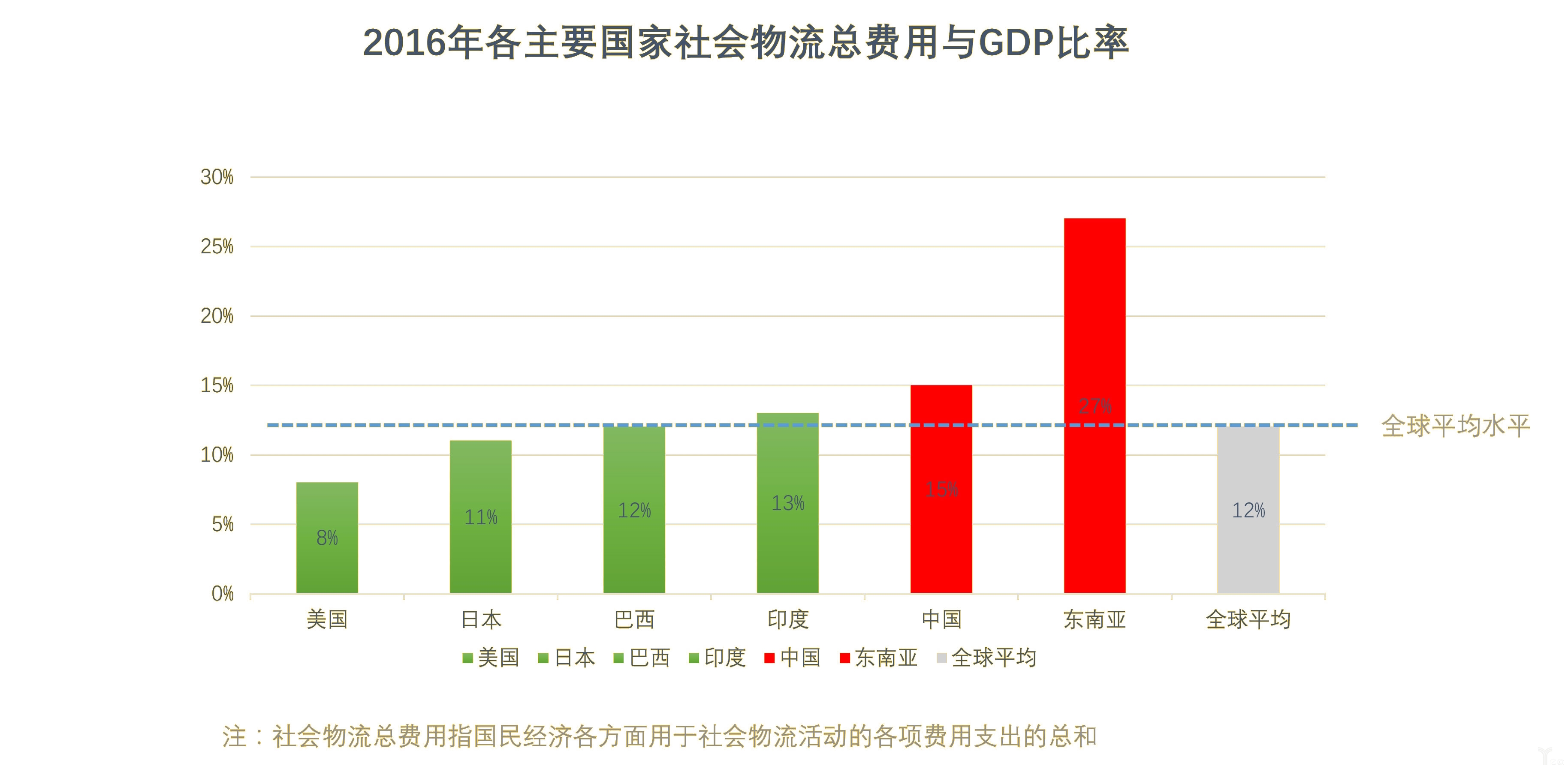 但放到世界范圍內看,我國物流業與其他國家相比仍存在不小的差距,社會物流總費用與GDP的比率高出全球平均水平近兩個百分點,高出美國7個百分點。與一些發展中國家相比,如巴西、印度,我國的比率同樣不容樂觀。