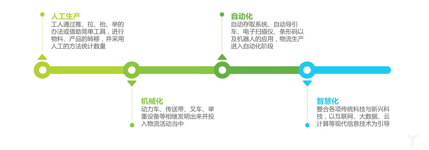 艾瑞咨詢發布《2017年中國物流科技行業研究報告》,報告指出:物流業的發展經歷了人工生產、機械化、自動化再到智慧化的歷程。人工生產的比例逐漸降低,物流作業過程中的設備和設施逐步自動化,但總體上與美國、德國等西方發達國家相比差距較大。工業4.0的提出,強調利用物聯信息系統將生產中的供應、制造、銷售信息數據化、智慧化,最后達到快速、有效、個性化的產品供應。對于物流科技而言,即整合傳統和新興科技,以互聯網、大數據、云計算、物聯網等現代信息技術提升物流智能化程度,增強供應鏈柔性。