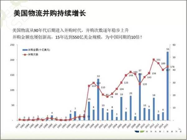 美國物流行業(yè)從90年代初開始進入并購時代,并購次數(shù)、金額逐年上升。從90年代初開始一直到現(xiàn)在,美國每年都有上百起并購案例發(fā)生,每年的并購交易額都超過百億美元。